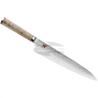 The 24 cm-long GYUTOH from MIYABI is perfect for cutting or slicing through meat or fish. Its slim yet stable blade delivers a perfectly controlled and clean cut. It has an authentic Japanese profile with an extremely sharp Honbazuke honing and is symmetrically polished at an angle of 19 degrees. The blade is first sharpened twice on rotating stones and is then polished on a leather wheel. Ease of handling is guaranteed by the handle, made of beautiful Masur birch, creating a thing of beauty with its light and dark lines. The interplay of colours within the graining represents an attractive addition to the floral Damask pattern on the blade, making each knife a unique work of art. The D-shaped handle also offers perfect balance, guaranteeing optimum control and fatigue-free cutting. A core of MicroCarbide MC63 powder steel is used to produce the blade, embedded in 100 layers of two different types of steel, both with different degrees of hardness. The CRYUDOR® blade is also ice-hardened in a specially developed process at -196 degrees Celsius to give it a final hardness of around 63 Rockwell. Cutting meat, fish and vegetables is a breeze with the GYUTOH from the MIYABI 5000MCD series.