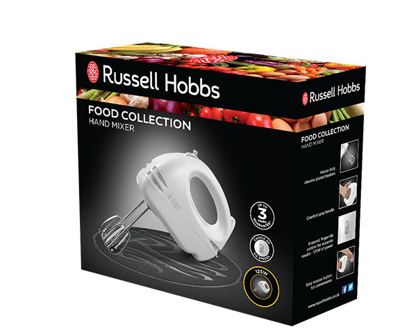 Use the Russell Hobbs Food Collection Hand Mixer to mix egg whites, cake mixture and batter to optimum consistency. The Russell Hobbs Food Collection Hand Mixer comes in a solid white glossed body and features an easy release button for simple beater removal. The six speed settings mean that you can select the appropriate speed for the food type and create accurate results every time.