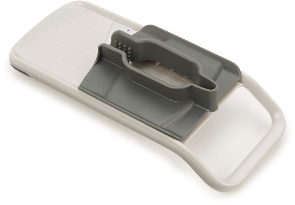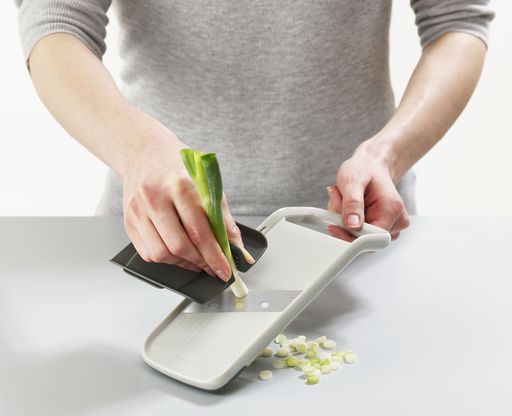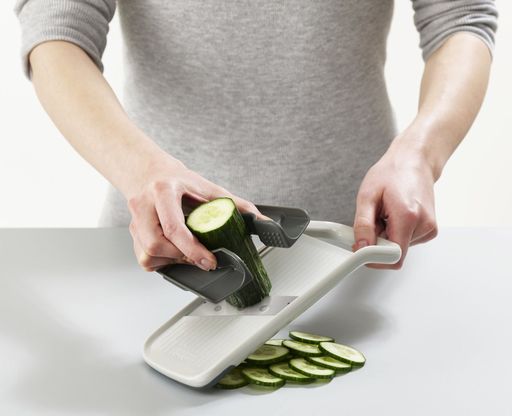 The Joseph Joseph Multi-grip Mandoline Duo includes 3 handles. A pinch grip for small objects, a middle grip for cutting circles of, for example, cucumber, or a flat handle for making longer slices of food such as onions or courgettes.