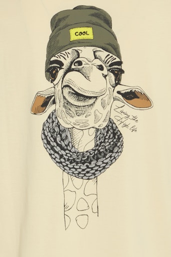 - Giraffe wearing a hat and scarf printed on chest and back panels.