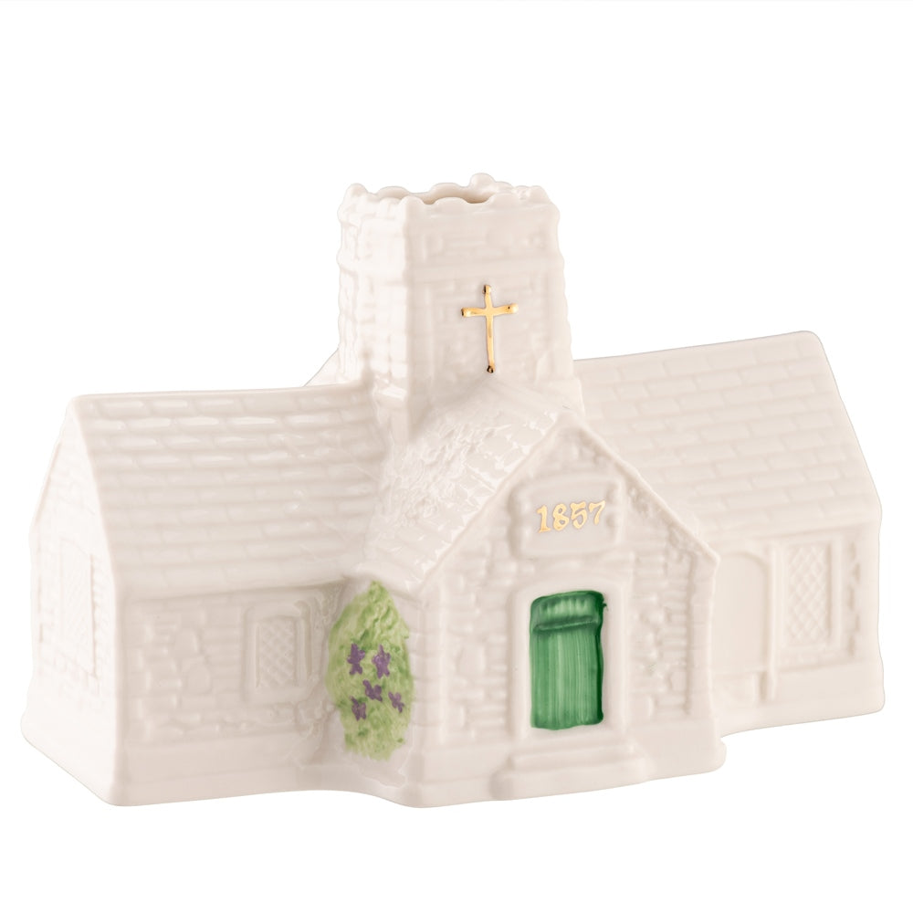Belleek introduces the Church Votive for 2022,  this is a stunning addition for your Belleek Village Collection. In traditional Irish style the Church which is a cross shape, having a porch at each side, is embossed with fine stonework and diamond patterned windows. Hand painted with a gold cross on the steeple and dated 1857, there is  floral greenery on the side of the front door, there and potted trees on the back of the piece.