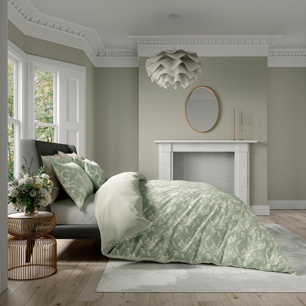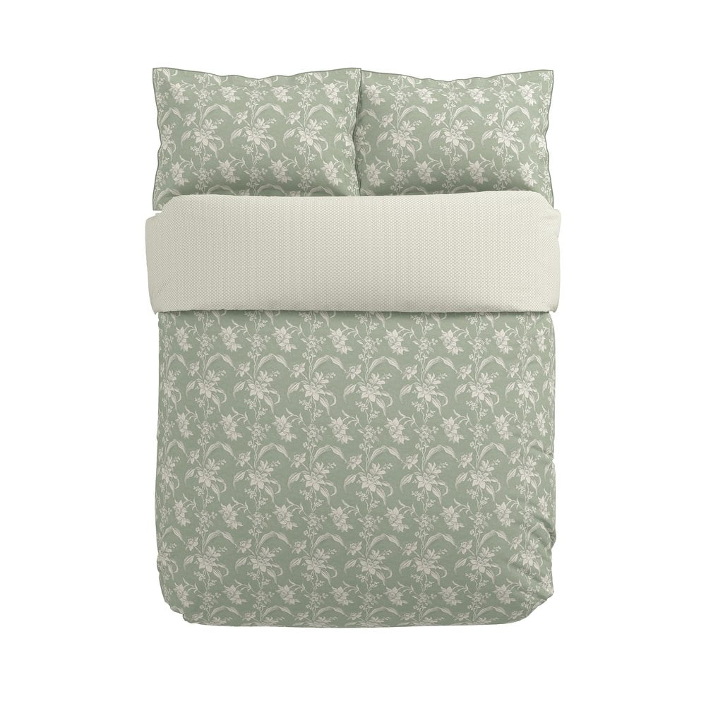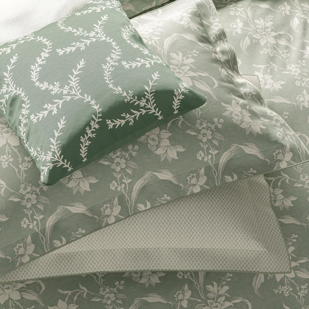The floral pattern adorning this duvet set was inspired by a pencil and watercolour design for a silk textile made in the 1860s by J.D. Cornuaud, which is housed in the V&A’s collection of prints, drawings and paintings in South Kensington. Features an all over daffodil floral pattern front with a small scale scallop pattern reverse. 100% BCI cotton. 200 thread count percale.