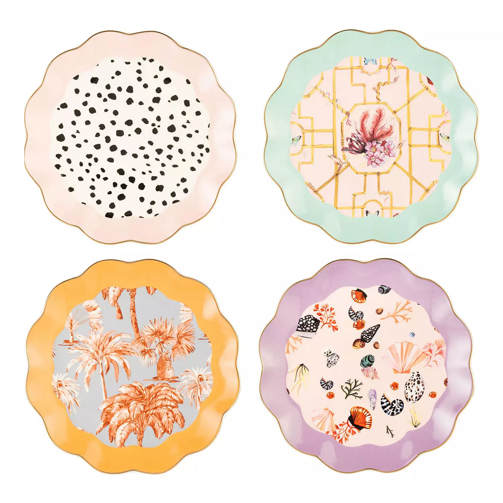 Each plate is adorned with an Eleanor Bowmer print, including: 'Miami Shells', 'Trellis', 'Sunset Palms' and 'Dalmatian Dot'.