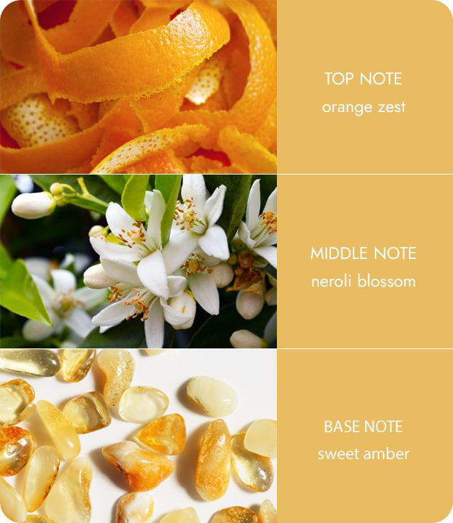 - Sparkling orange zest with fresh neroli and sweet amber.