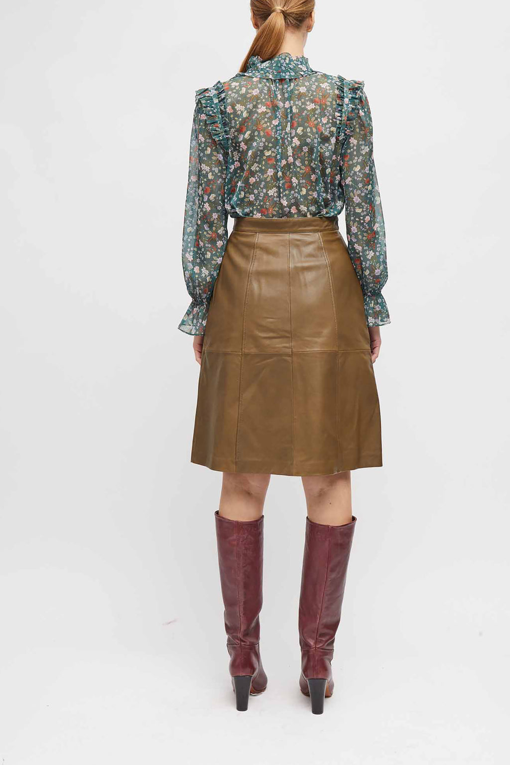 - High neck with ruffle detailing.