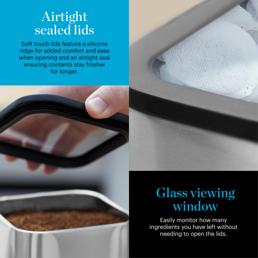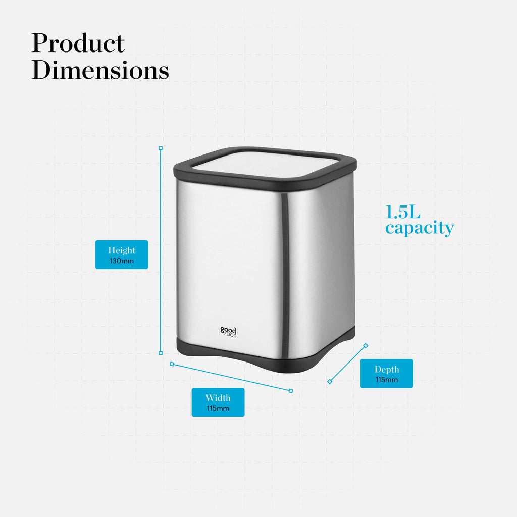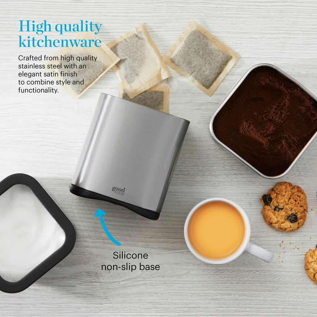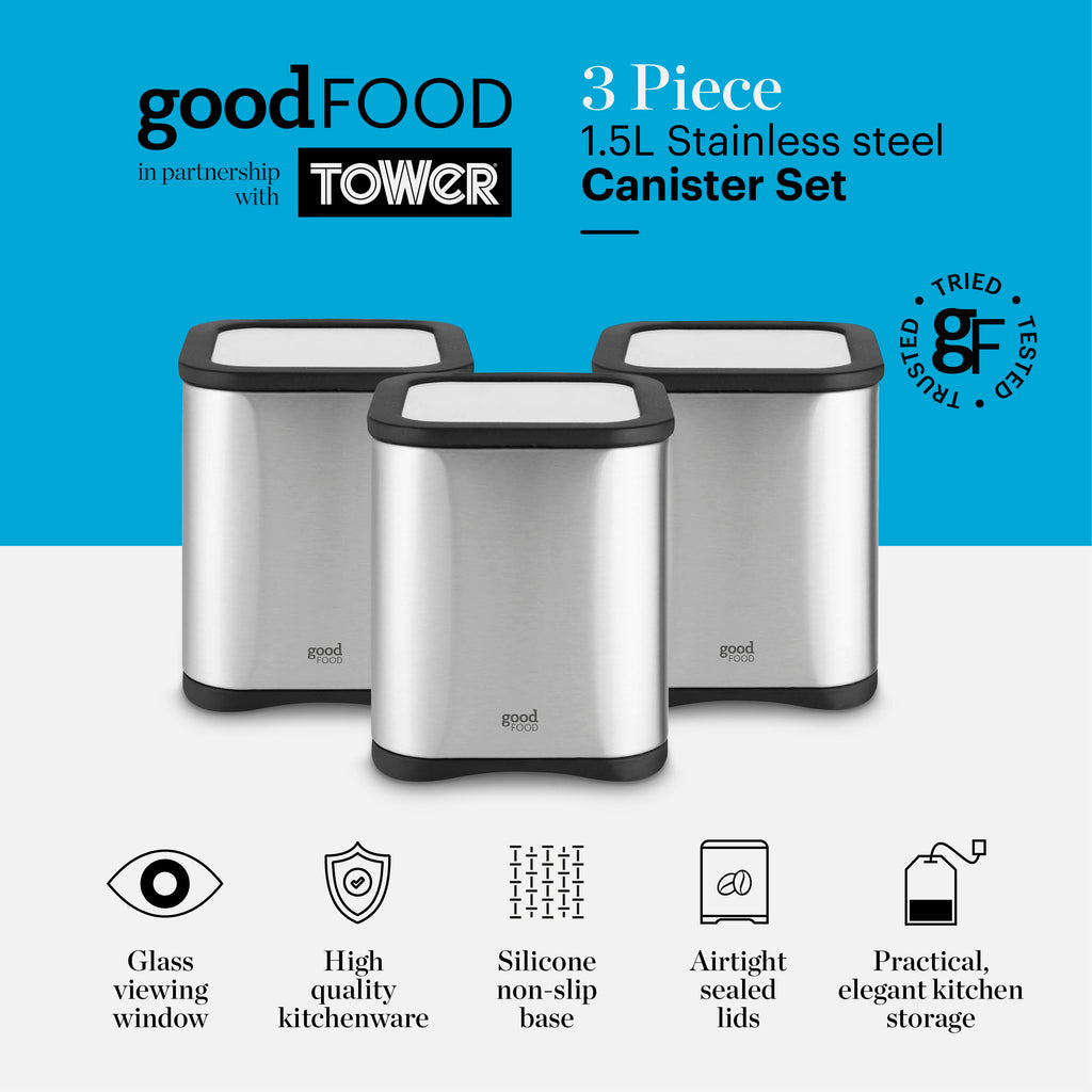 This set of 3 storage canisters from Good Food in partnership with Tower are a great addition to your kitchen collection. The high quality stainless steel bodies come complete with an elegant mirror finish, combining practicality and style. Each 1.5 litre canister lets you store large amounts of tea, coffee, sugar or other loose ingredients on your kitchen worktop, all while protecting the contents from dust or moisture. The soft touch silicone lids are comfortable to remove, giving you easy access to the contents, while the airtight seal locks in the freshness to keep your ingredients fresher and tasting better for longer. The lids also feature glass viewing windows, so you can easily monitor your stock levels without needing to open the lids. Take the guesswork away from knowing when it's time to refill. All canisters have non-slip silicone feet for added stability and to protect your worktop from scratches. Just a simple wipe with a cloth is needed to clean and maintain the glossy finish.