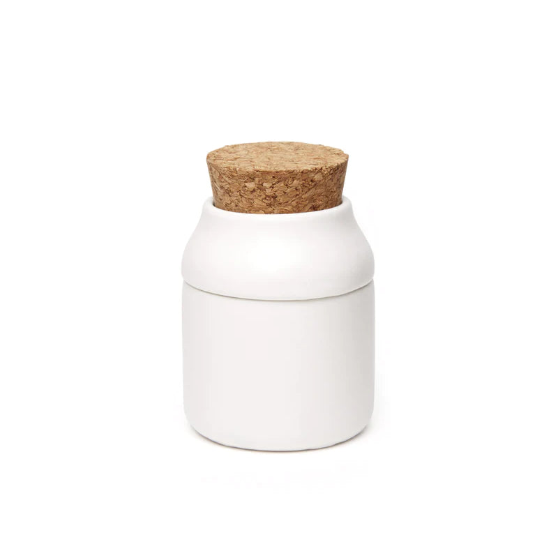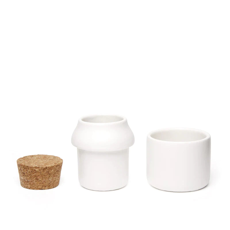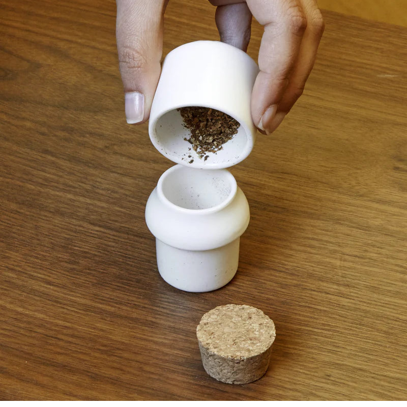 Sleek ceramic herb grinder with top storage compartment and cork stopper.