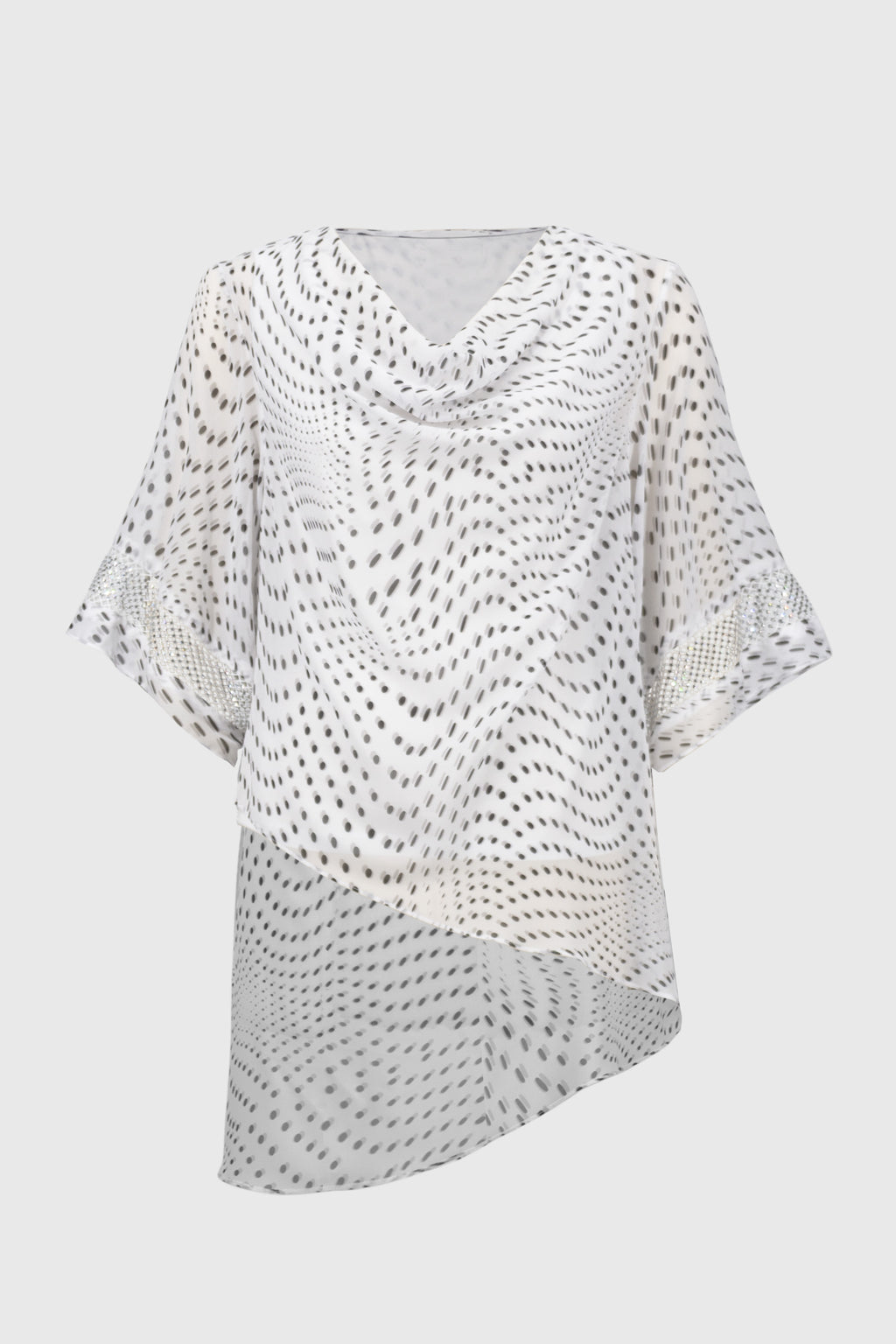- Three-quarter bell sleeves with rhinestone mesh inserts