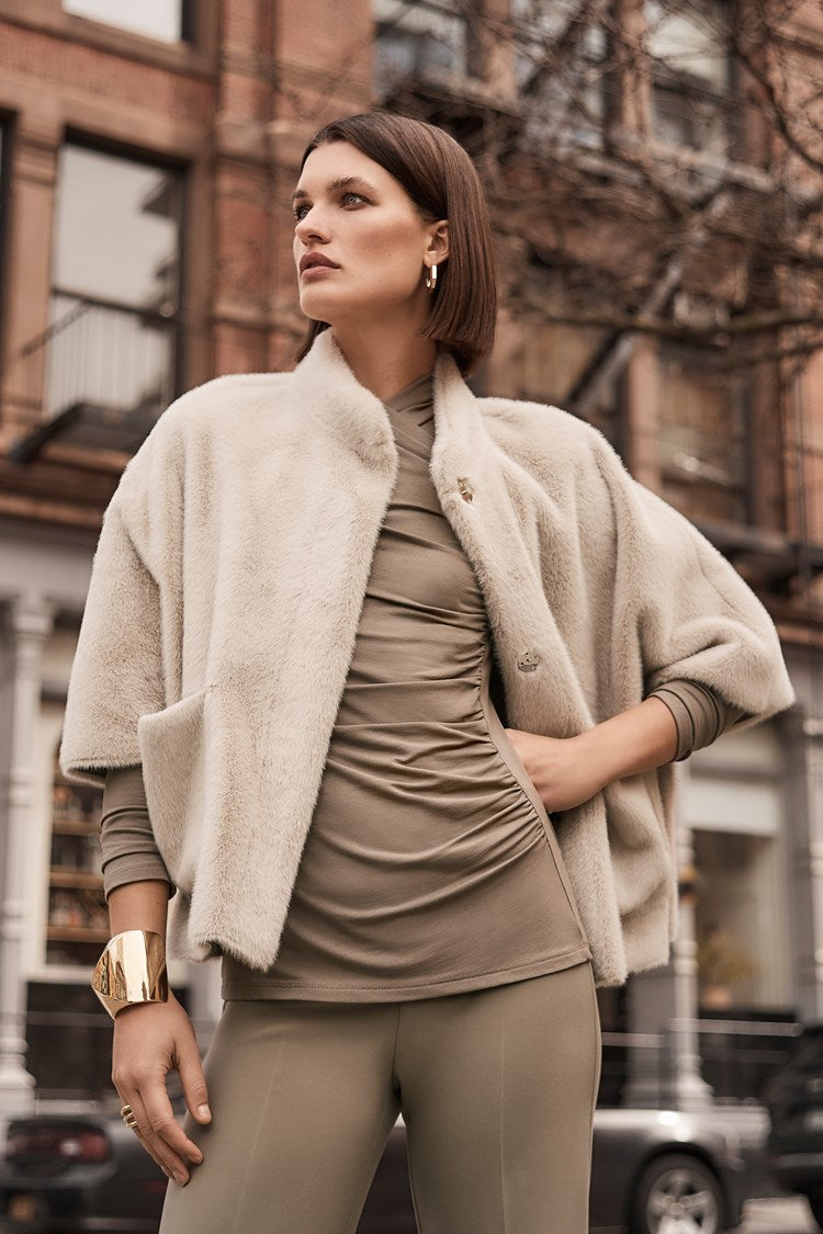 - Woven suede and faux fir fabric.