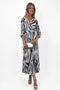 - Includes a belted waist with a circular buckle, accentuating the silhouette.