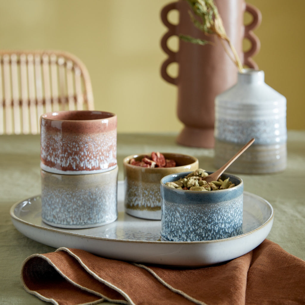 This Kiln Accent set of 4 Small Round Pot presented in Rust, Slate, Ochre and Taupe feature a unique double dipped glaze effect . They are truly versatile small can be used to serve your favourite dip, a generous portion of sauce and oils, nibbles or your favourite cocktail ingredients or with a candle or trinket pot.