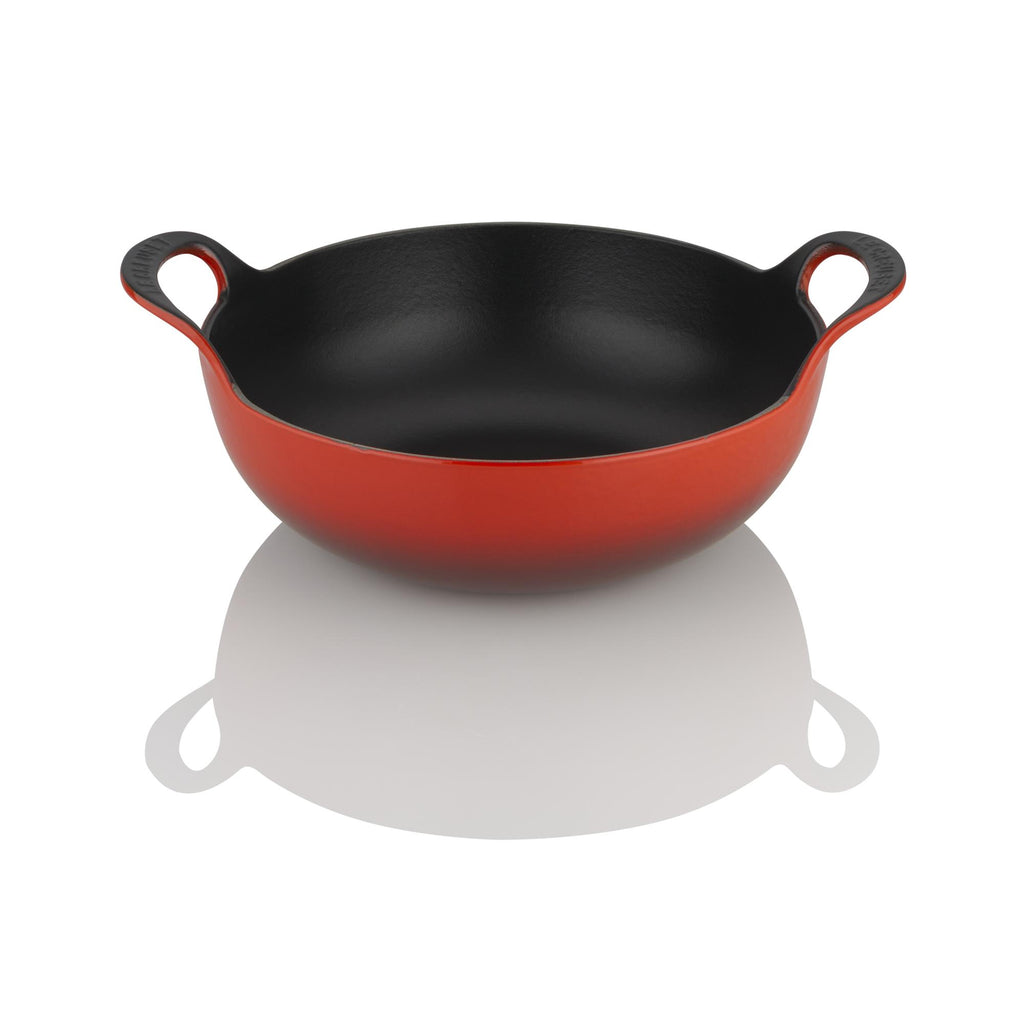 This wok-like bowl shape is perfect to cook curries with marinated meats, vegetables and spices and generally for stir-frying vegetables. Made of cast iron the Balti Dish is designed to enhance slow-cooking by heating evenly for tender, succulent dishes. The seamless concave cooking interior is perfect for stirring and tossing ingredients. Once the food is cooked it is kept warm and served in the bowl, then shared among the table with naan, a flat bread similar to pita.