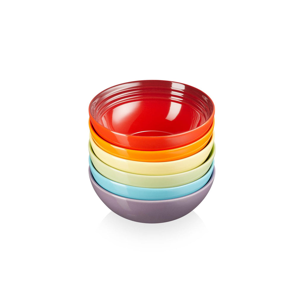 A colourful set of six 16cm Cereal Bowls, ideal for serving muesli, porridge or cereals at breakfast time. This set makes a perfect gift or is the ideal way to start collecting in to the Le Creuset rainbow of vibrant colours. Each Le Creuset Cereal Bowl is crafted from premium quality clay and fired at very high temperatures to create stoneware that has a robust and high-quality finish. Each piece is oven, microwave and dishwasher safe. This set features an array of some of the most iconic Le Creuset colours – Cerise, Volcanic, Soleil, Palm, Teal and Ultra Violet. Presented in a premium colour card sleeve this set makes a great gift for those who love colour.