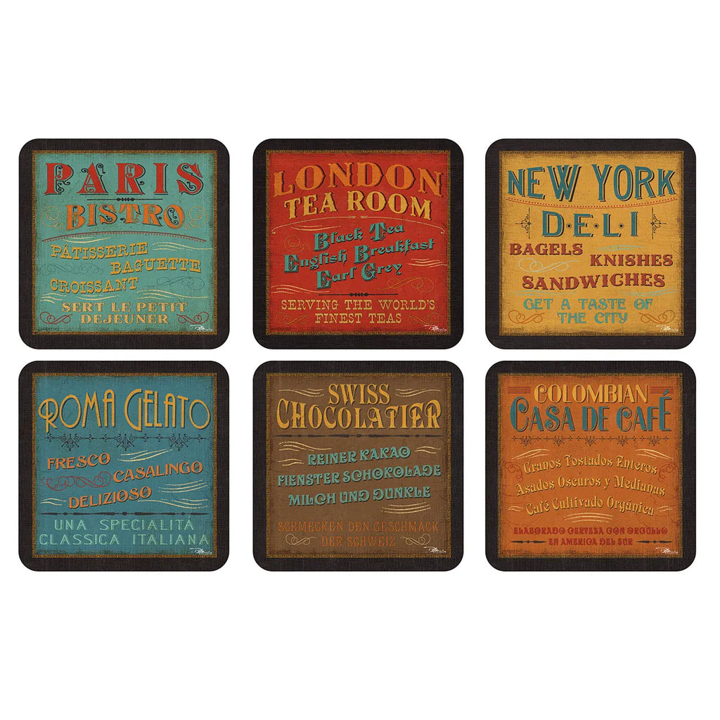 Add a colourful touch to your home with this set of six lunchtime coasters, each with an illustration of vintage lunch themed advertising. These coasters will protect from stains and scratches, and give a retro feel to tables or worktops.