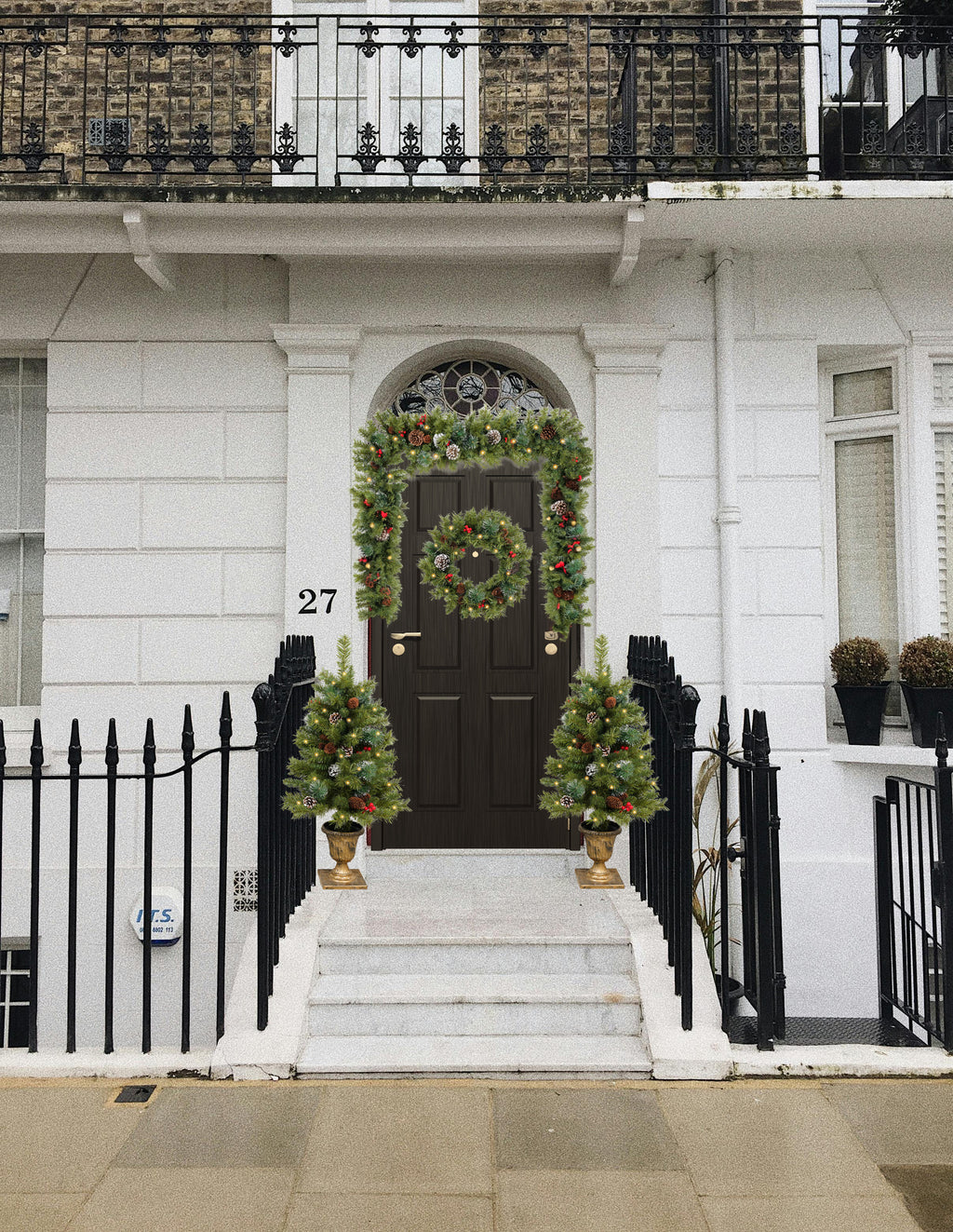 Create an inviting holiday entrance with this comprehensive Prelit Cone & Berry Porch Set, expertly designed to elevate your seasonal décor. This curated collection combines a berry and cone-adorned garland, coordinating wreath, and two pre-illuminated miniature artificial trees to establish a unified, polished display. The integrated lighting system removes the complexity of manual installation, while premium artificial materials maintain their appearance throughout the festive period. Each component works in concert to deliver sophisticated results suitable for any porch style, from intimate cottage settings to expansive entrances. Achieve a professionally styled holiday presentation with straightforward assembly, freeing you to focus on celebrating rather than decorating.
