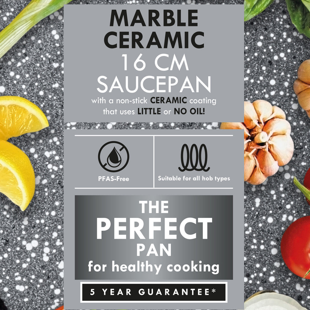 - Perfect for everyday cooking, this Progress Marble Ceramic 16 cm saucepan features a non-stick surface for easy cleaning after use.