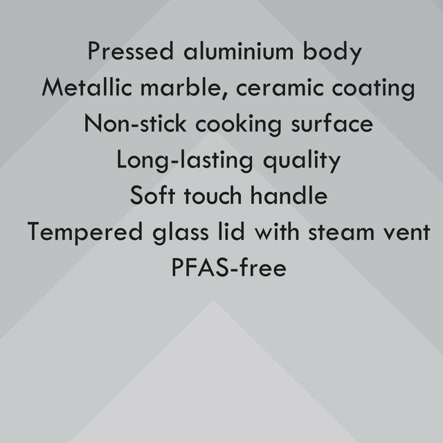 Perfect for whipping up delicious soups and sauces, this Progress Marble Ceramic 16 cm saucepan allows you to cook healthier meals using little or no oil. Crafted from durable pressed aluminium, this lightweight saucepan is great for small dishes, cooking 1-2 servings and features a non-stick surface for easy cleaning. The metallic marble ceramic coating offers improved heat distribution allowing you to cook at higher temperatures and is PFAS-free to avoid releasing harmful chemicals into the environment.