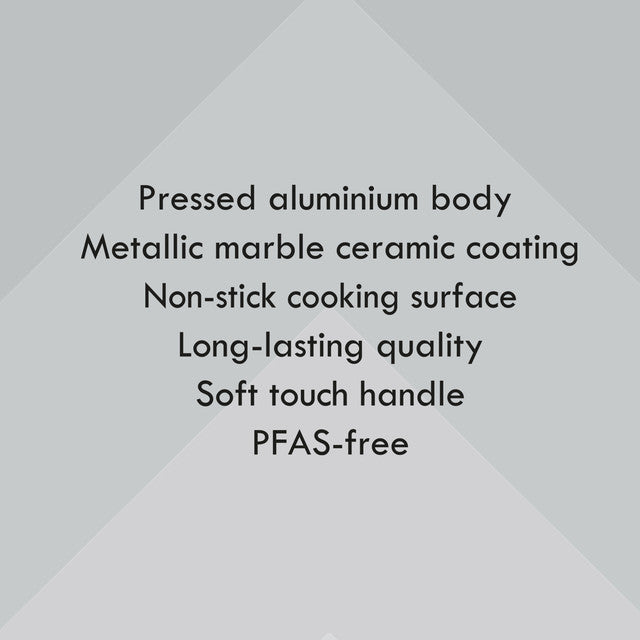 Offering a perfect combination of practicality and style, this Progress Marble Ceramic 24 cm frying pan is ideal for cooking fresher and healthier meals using little or no oil. Crafted from durable pressed aluminium, this lightweight frying pan is great for cooking larger meals and features a non-stick cooking surface for easy cleaning after use. The metallic marble ceramic coating offers improved heat distribution and is PFAS-free to avoid releasing harmful chemicals into the environment.