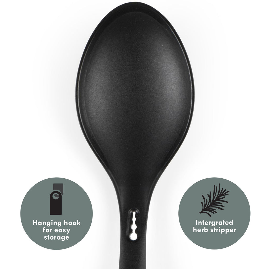 Ideal for total novices and chefs alike, this Progress solid spoon with soft touch handle is incredibly practical and perfect for serving, stirring and more. Crafted from durable nylon, this spoon features an integrated smart function ideal for removing herbs and is non-stick safe. Easy to clean with hot soapy water, this spoon also features an on trend green cuff with hanging loop for easy storage and is developed to withstand the demands of everyday cooking.