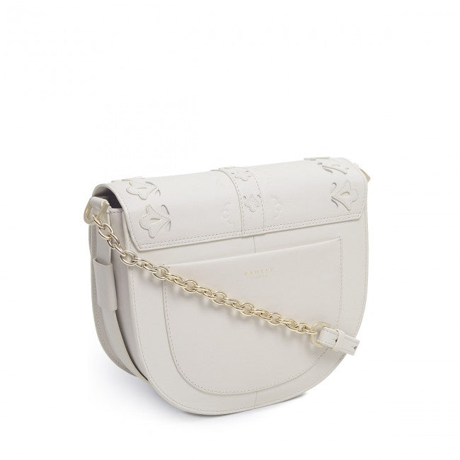 - Adjustable crossbody strap with chain detailing.