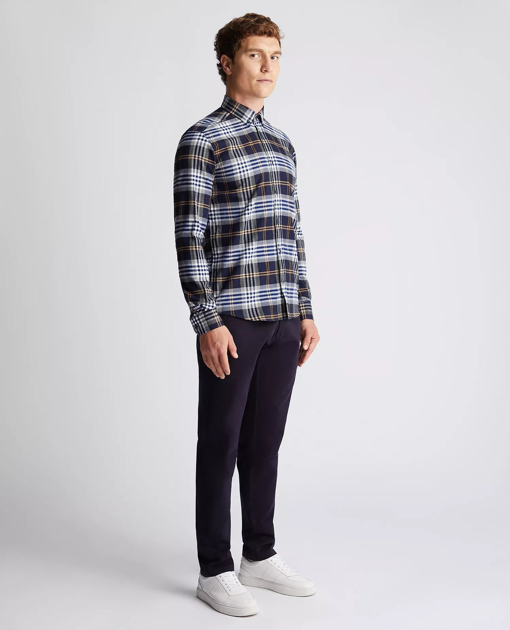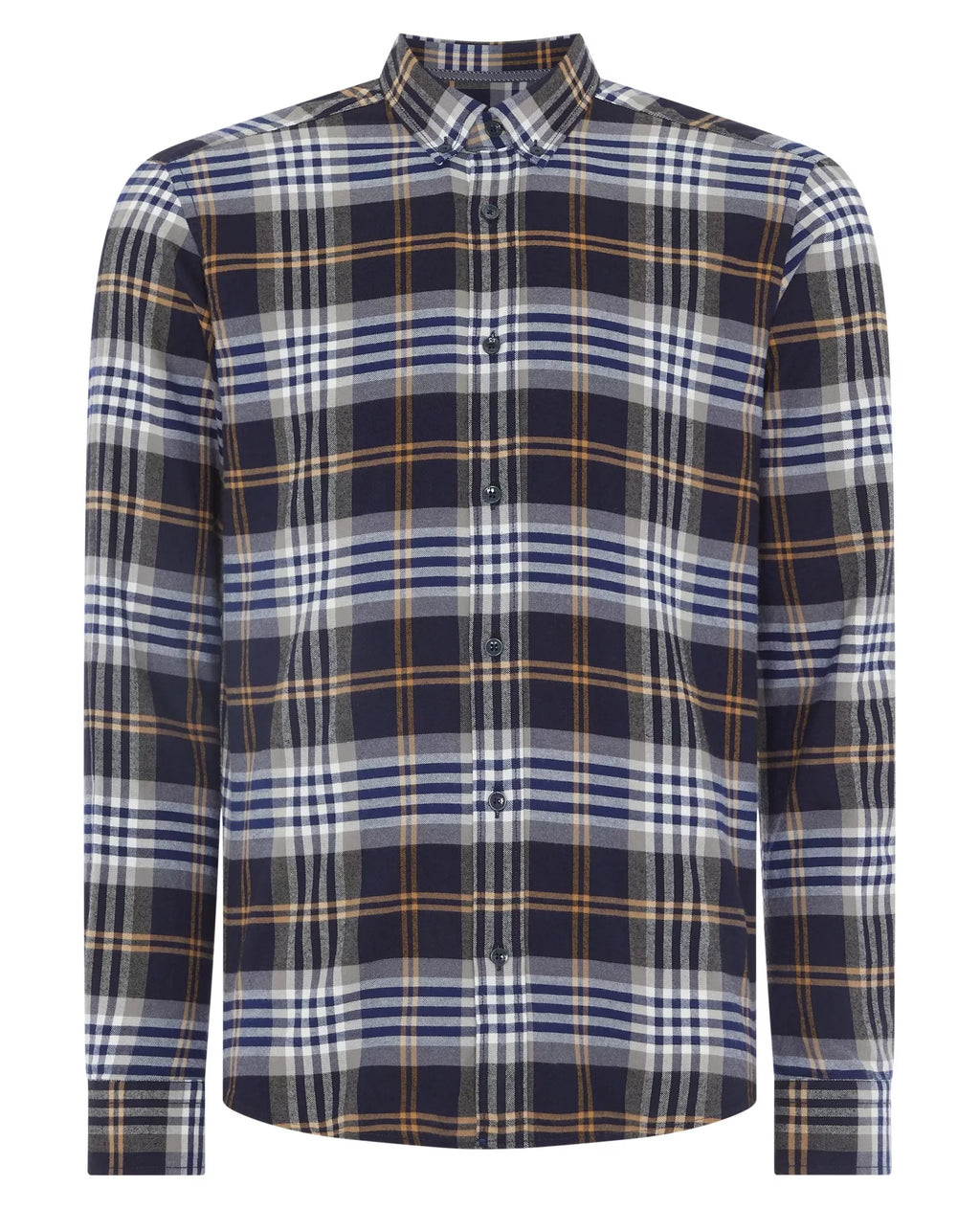 Dark blue slim fit checked brushed cotton shirt with buttoned down collar and placket front.