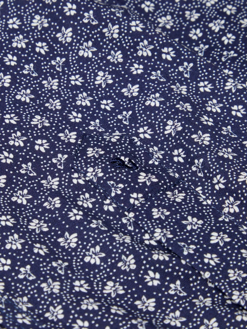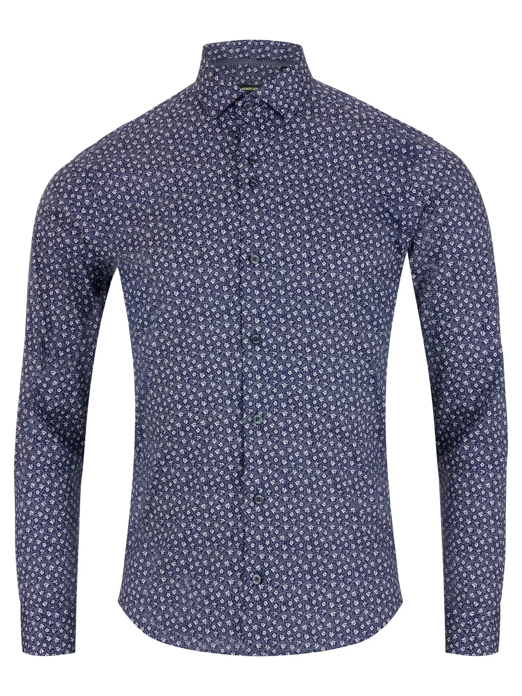 Dark blue slim fit print cotton stretch shirt and concealed button down, cutaway collar.