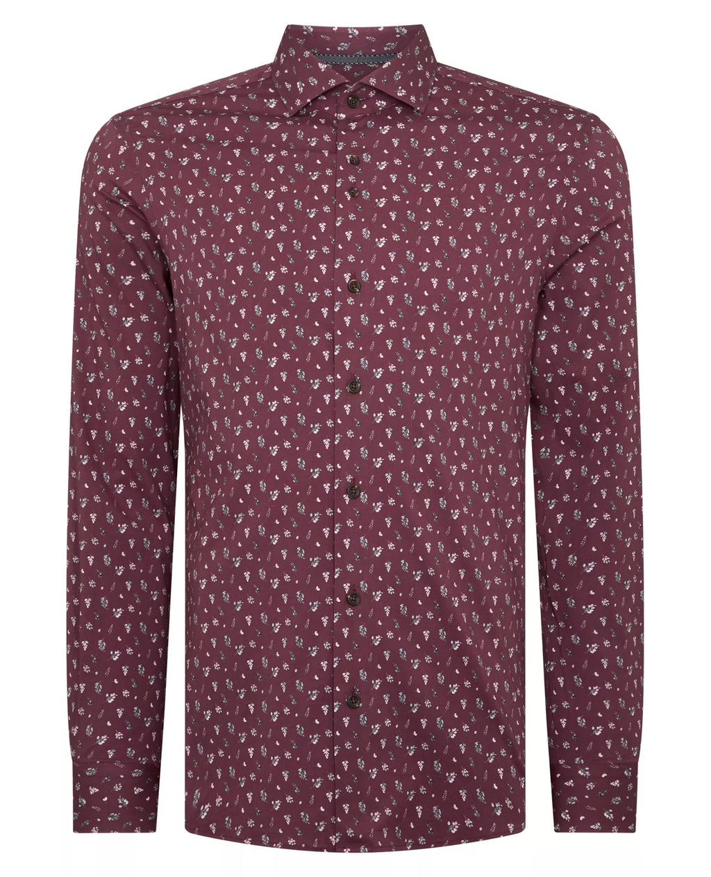 Wine floral print tapered fit shirt. Concealed button down, French front, rounded cuff and tailed hem. With 97% cotton and 3% Lycra this shirt allows for comfortable stretch and movement.