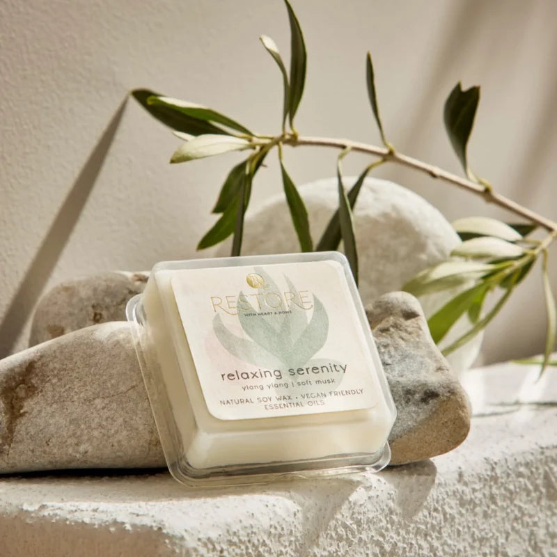 Discover a modern approach on fragrance with Restore wax melts. Designed with a unique, soap-like texture and distinctive square shape, these hand poured vegan-friendly soy wax melts infuse your space with soothing aromas to uplift your spirit and nurture relaxation. Refreshing greens, elegant florals, and warm sweetness meld together in this beautifully balanced fragrance, offering a tranquil escape for mind and spirit. Perfect as a thoughtful gift or a self-care indulgence, they’re a beautiful way to create moments of calm in your daily life.