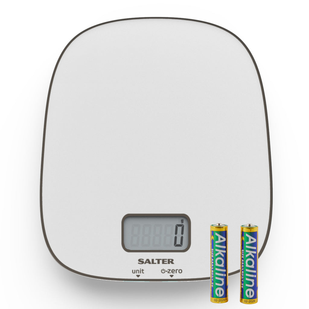 - Wonderfully designed, the kitchen scale is complete with 2 x AAA batteries and boasts a large display that is incredibly easy to read.