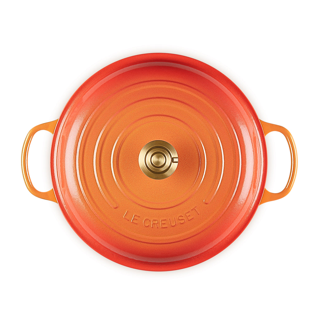 Le Creuset proudly introduces Flamme Dorée, a testament to Le Creuset's decades-long innovation and forward-thinking design. Translated to “golden flame,” this limited-edition centenary colour celebrates Volcanic, Le Creuset's iconic original hue, now glistening with a golden sheen. This exclusive colour is sure to captivate and elevate any kitchen collection.