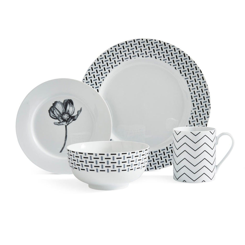 Impress your guests with this striking 16-piece dinner set from the Portmeirion Home collection. A mix-and-match design, the dinner plate and cereal bowls feature a bold grey and black patterned border, while the side plates are adorned with a delicate greyscale flower and the mug features an eye-catching zig-zag all-over pattern. A wonderful addition to a busy home, this monochrome porcelain set can be used in the dishwasher and microwave too.