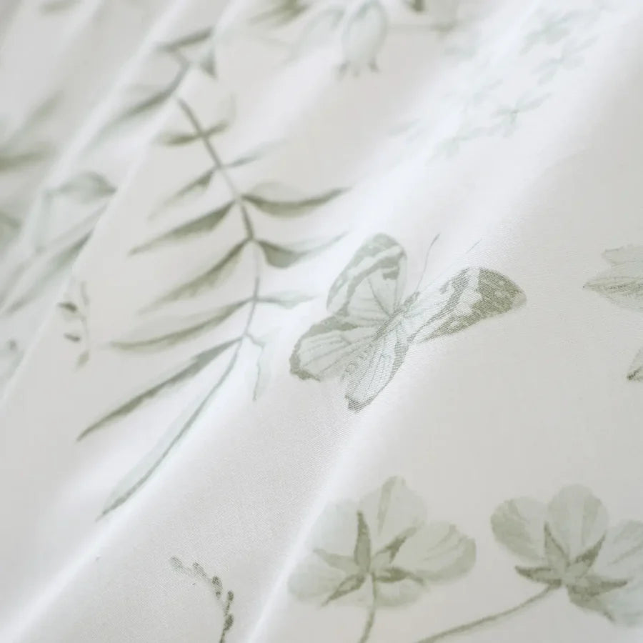 Transform your bedroom into a tranquil oasis with the enchanting Thea Floral Duvet Cover. Featuring a delightful wild garden design, this bedding showcases intricate greenery and whimsical butterflies against a soothing natural backdrop. The fully reversible duvet allows you to switch up your style effortlessly, while the luxurious 200 thread count percale cotton ensures a soft and breathable sleeping experience. 100% pure cotton, 200 thread count percale weave. Machine washable at 40 degrees, tumble dry on low. Made in accordance with MADE IN GREEN by OEKO-TEX® standards.