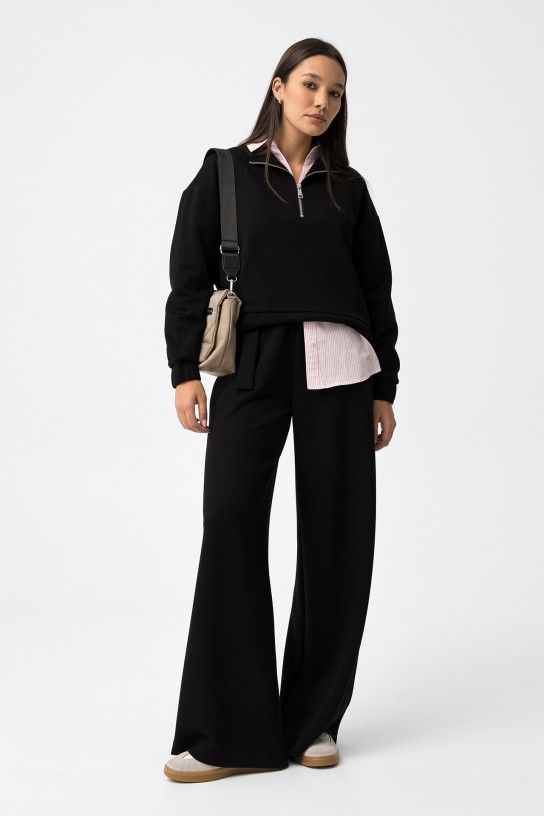 Palazzo-style wide-leg pants with high waist and front closure. Adjustable belt with metal ring detail.