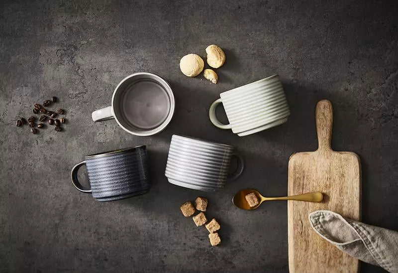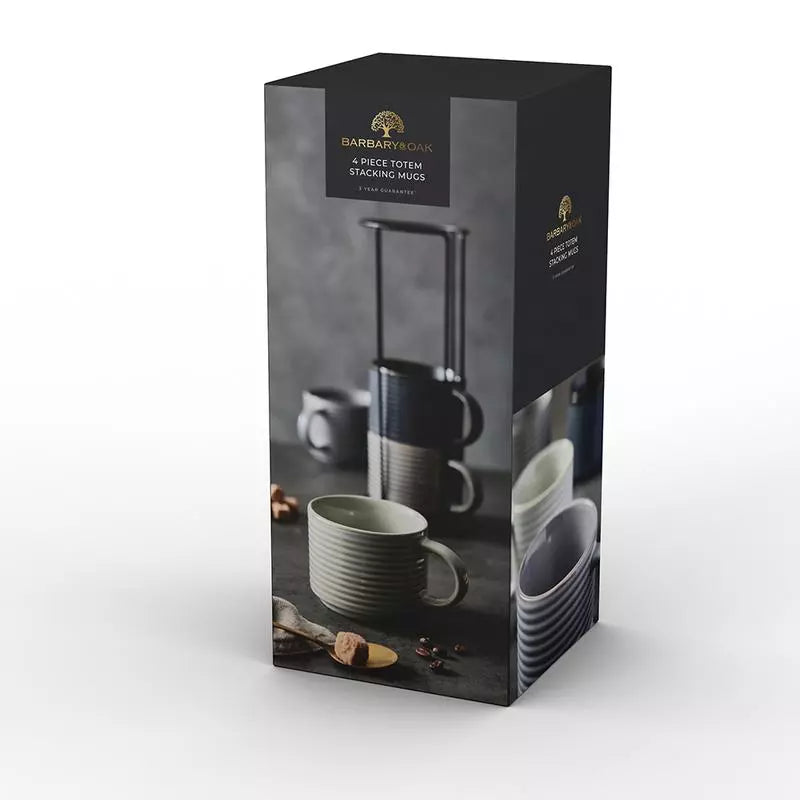 Elegantly crafted 4-piece mug set with a stackable design that saves space in the cupboards.