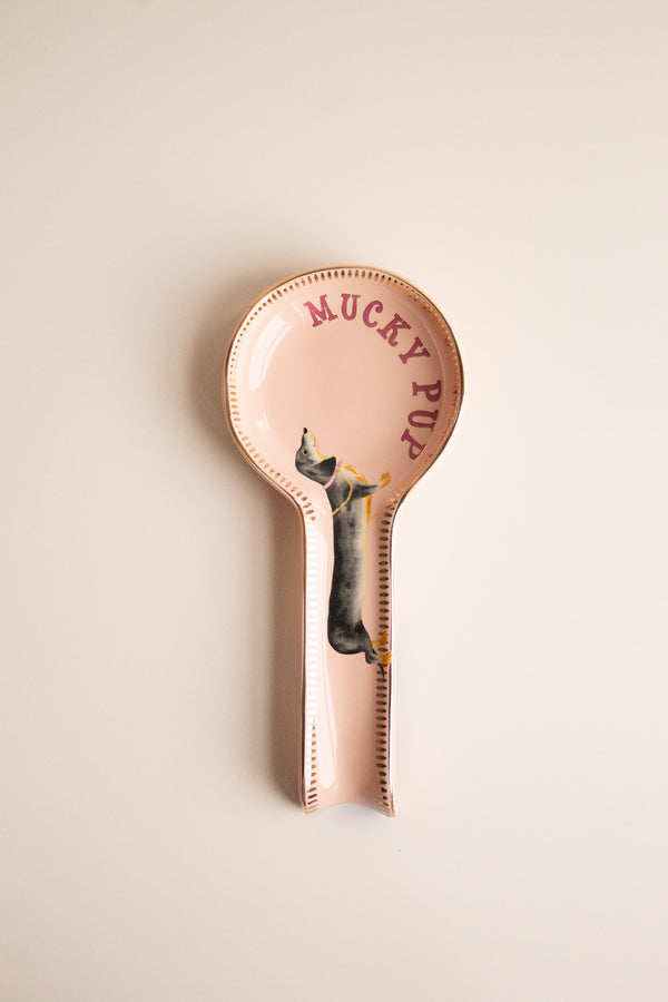 How adorable is this doggie spoon rest?! A 'mucky pup' slogan with my cute sausage doggie illustration and gold detailing, the perfect iconic Yvonne Ellen mix, a charming touch to any countertop!