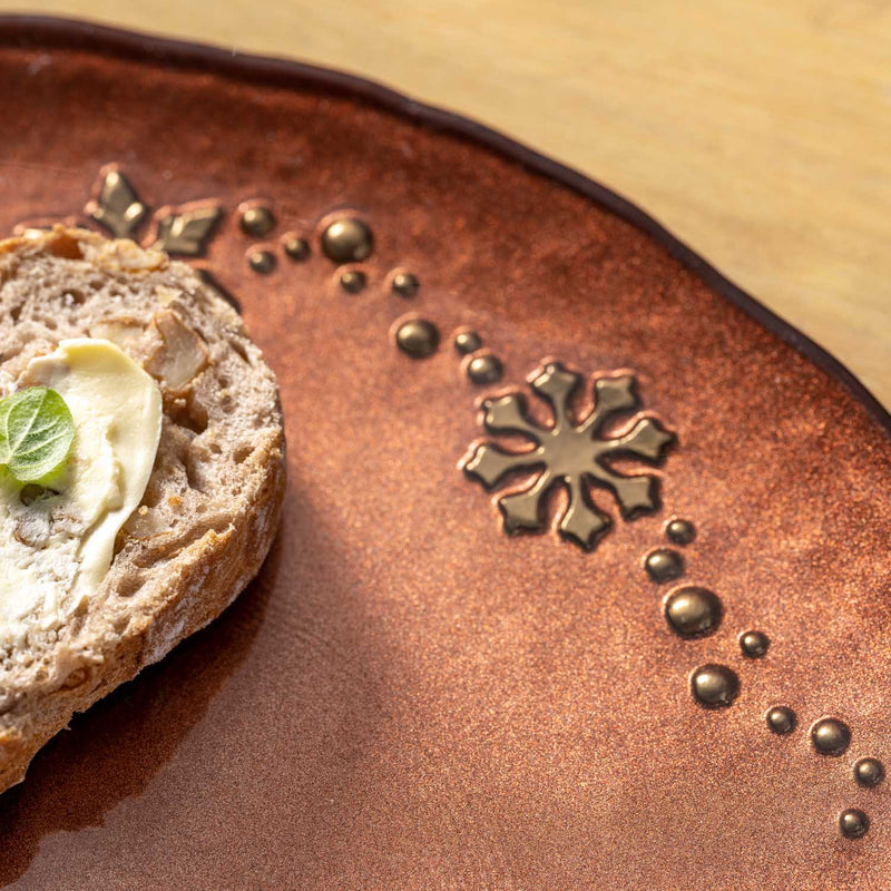 Christmas has come! This hand-painted plate with traditional snowflake decoration in gold provides the right festive mood. Versatile, it makes a wonderful serving plate for Christmas sweets as well as a classic advent decoration.