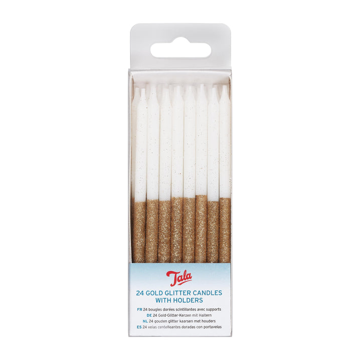 This set of Tala 24 Gold Glitter Candles and holders is a must-have for enhancing any cake or dessert. These candles add a stunning touch to birthdays and events, and with 24 candles and 24 holders included, they offer both safety and convenience when it comes to placement.