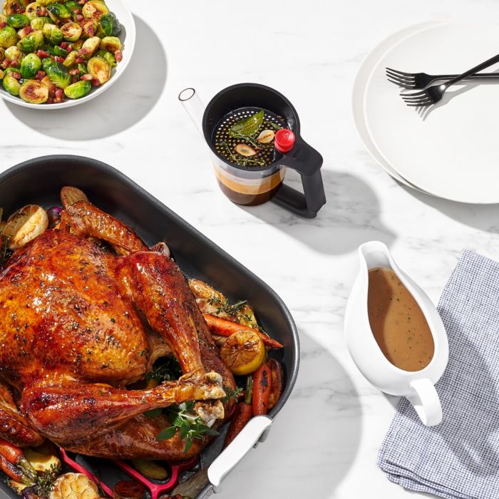 With the OXO Good Grips Fat Separator, making graving has never been easier. Place the stopper in the spout, pour pan drippings into the Fat Separator. The strainer filters even the tiniest bits and the fat will rise to the top. Remove the stopper and pour, the cooking liquid comes out first, leaving the fat behind. Measurement markings make following recipes simple, and the splatter shield prevents splashing while you pour. When you’re done, this Separator is dishwasher safe, and there’s on-board stopper storage, so the stopper doesn’t get lost. Available in 2-Cup and 4-Cup sizes.
