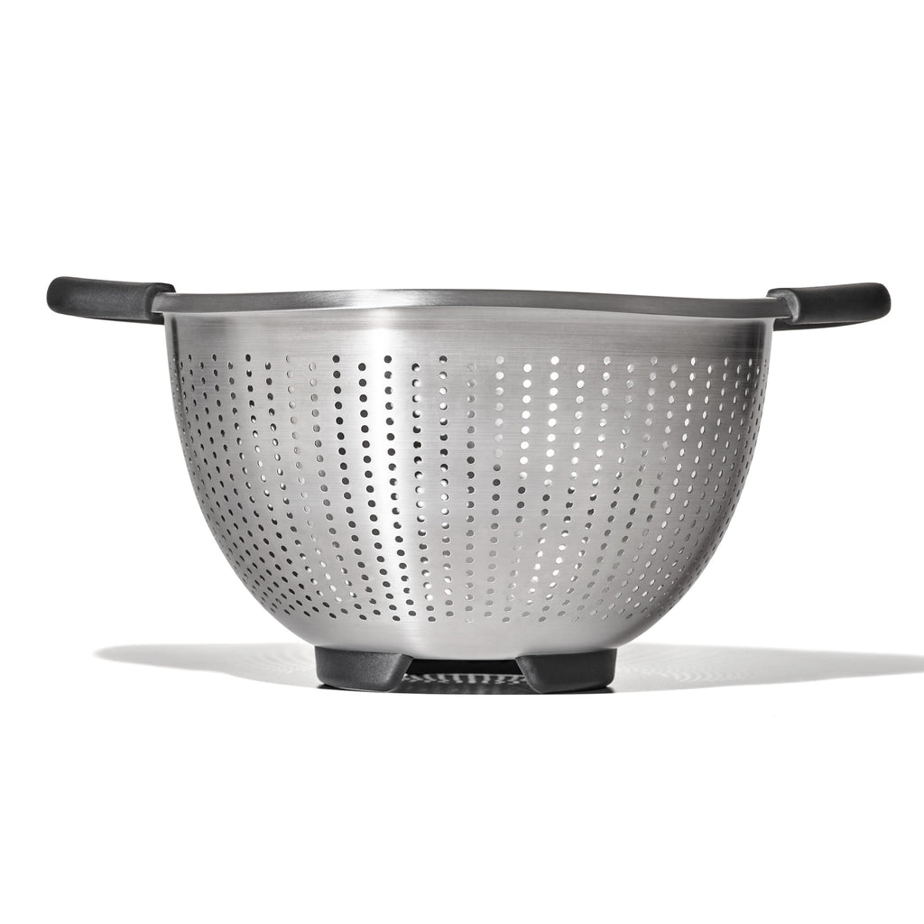 Whether you’re rinsing veggies or straining pasta, the OXO Good Grips Stainless Steel Colander is ready for the job. Elevated, non-slip handles provide a firm and comfortable grip, even when handling large batches. This Colander is constructed with five feet at the base that deliver stability in the sink and on the countertop and nest neatly in our Stainless Steel Mixing Bowls for convenient straining and storage. The perforated design ensures fast and thorough straining.