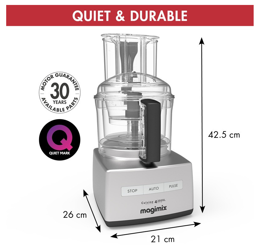 The Magimix 4200XL Food Processor is perfect for catering up to 6 people. With a minimal footprint for such a powerful and versatile machine, the 4200XL kneads up to 2 loaves (1kg) and grates up to 1kg vegetables in the main bowl.