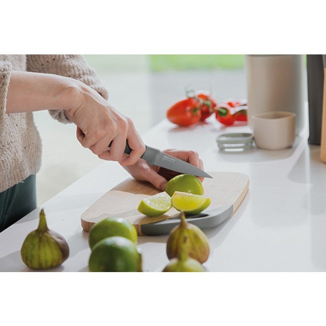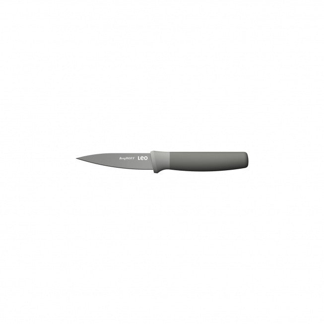 Slicing sweet potatoes, peeling apples or deveining shrimps, the Leo paring knife is your go-to for a wide variety of food preparation tasks. It's smaller non-stick coated stainless steel blade is perfect for precision jobs while the pointed tip can also be used to test the tenderness of your vegetables or meat or remove the seeds from a chili pepper. With it's recycled plastic that's been used for the handle, you're adding a different touch of green into your kitchen.