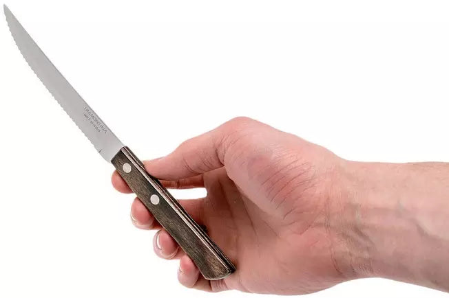 This steak knife cutlery set is made in Brazil for maximum quality and longevity. The ideal cutlery set for barbeques and outdoor cooking to efficiently cut through tough meats, steak and burgers. Steak knives featuring super sharp serrated blades made from rust and corrosion-resistant stainless steel. The rustic design features sculpted ergonomic solid wood handles made from high-quality Polywood from FSC-certified forests, impact and high temperature resistant with a 5-year warranty against manufacturing defects.