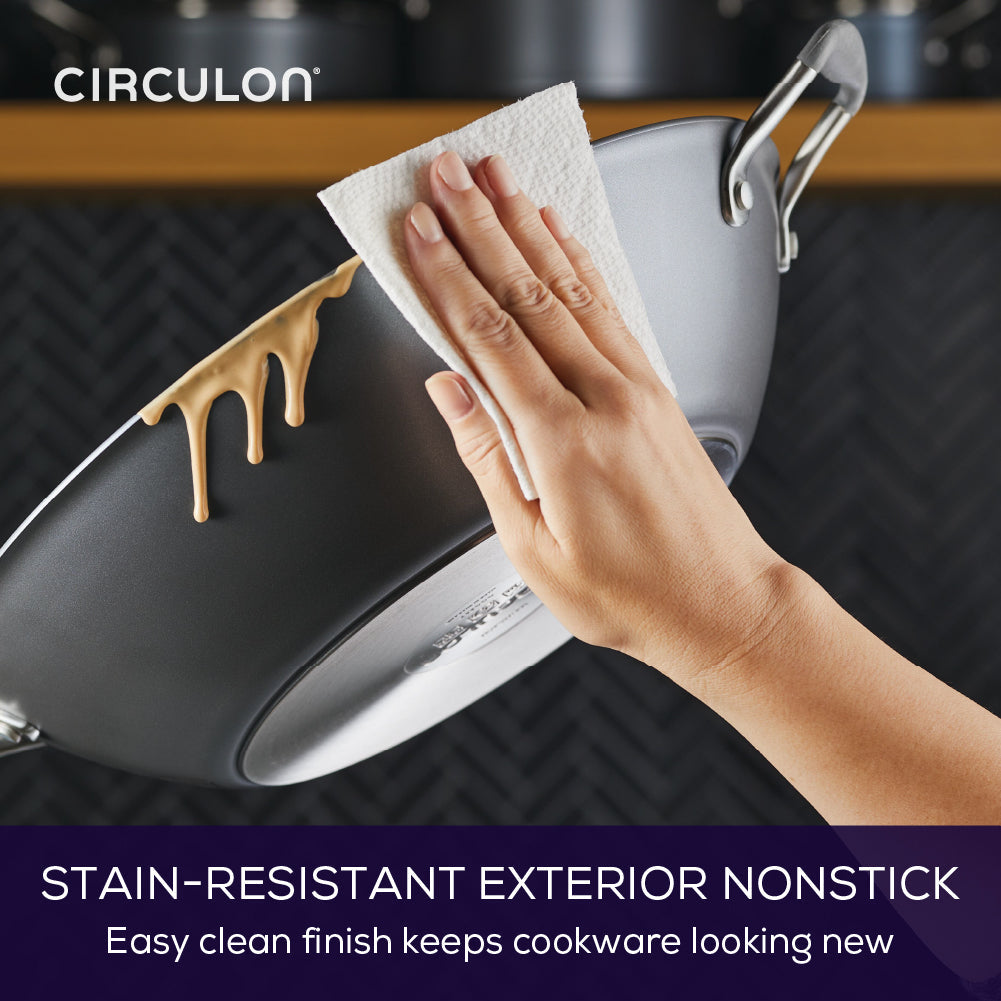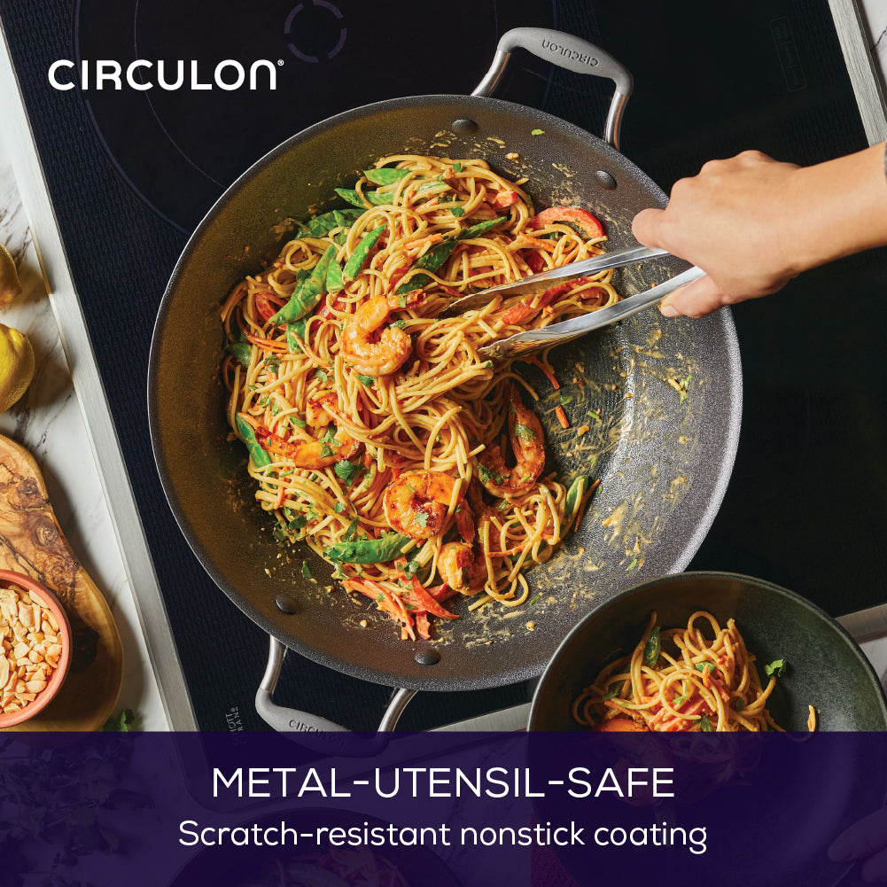 Have full faith in Circulon's triple layer Non-Stick cooking surface that lasts 130X longer than the competition and stands up to laboratory tests simulating 200+ years of daily wear and tear. Cooking with the ScratchDefense Wok ensures that your fine meats, vegetables and ingredients will slide effortlessly onto your plate.