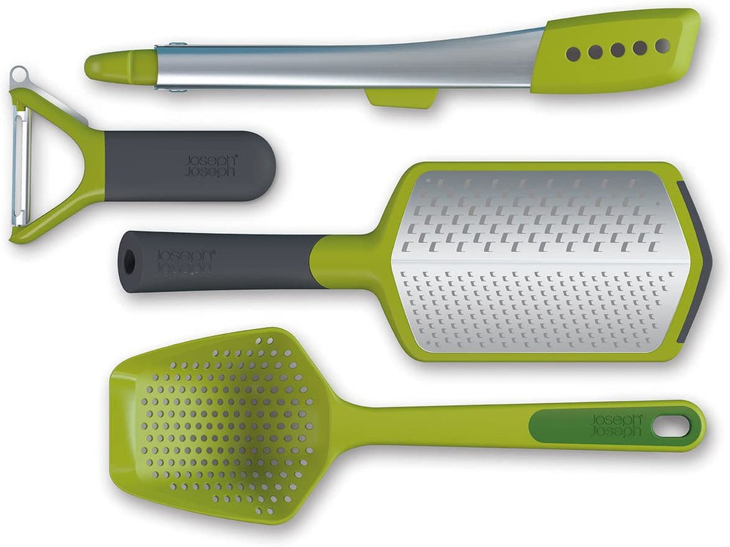 - Set Includes: Scoop plus colander, twist grater, multi-peel multi-function peeler and elevate tongs