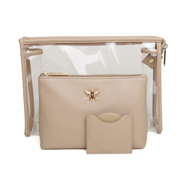 This 3pc travel gift set includes large zipped transparent toiletry bag,  vegan leather makeup bag and a travel compact mirror with pouch.