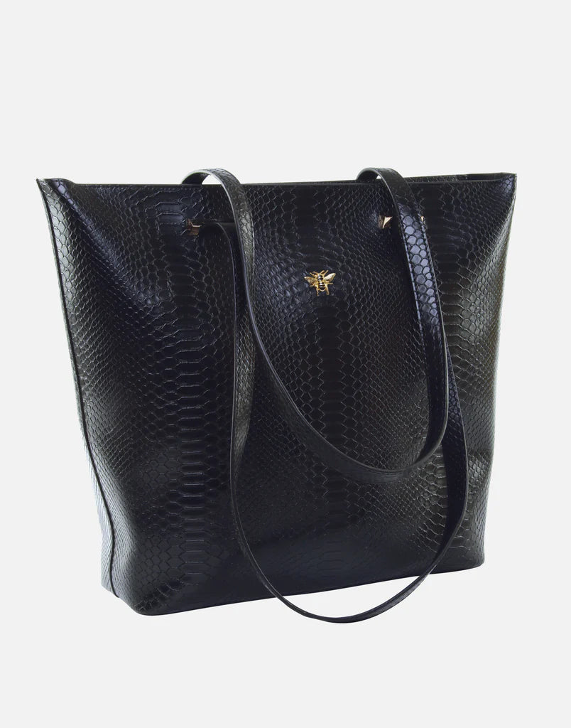 Fabulous tote bag crafted in fine vegan leather with snake print design, comfortable shoulder straps with gold metal detail and a very generous compartment for all your essentials.