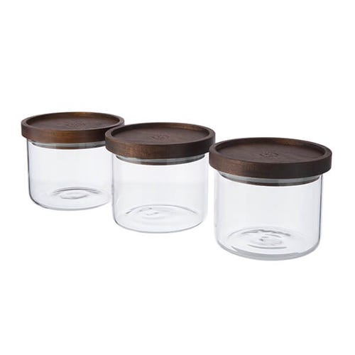 The Artisan Street set of 3 storage jars are made from clear glass with dark stain acacia wood lids. Ideal for storing dried foods like pasta, rice, lentils and other grains, the clear glass allows you to see the contents and the level. The acacia wood lids fit perfectly for a airtight seal and look stylish on display together.