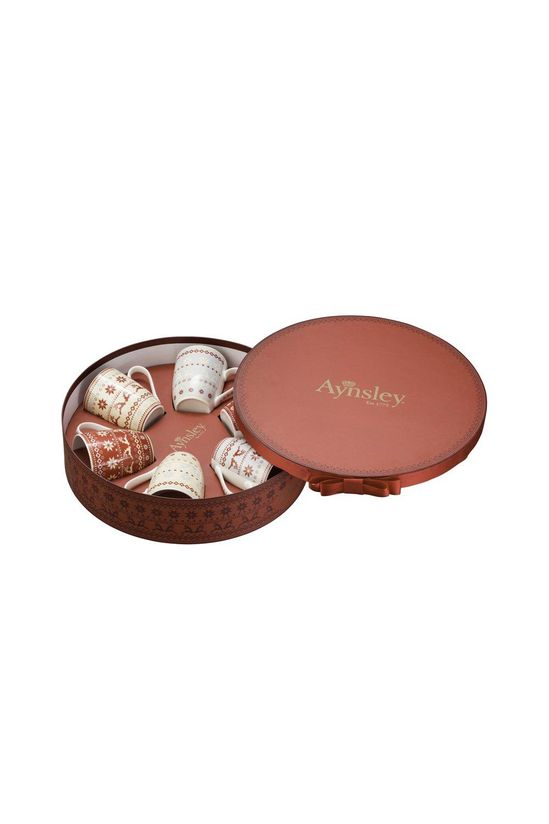 Experience the quintessential holiday ambiance with these Aynsley Fairisle mugs. Envision a cozy fireside evening, illuminated Christmas decorations, and your preferred hot beverage served in these festive vessels. Presented in an elegant hat box packaging, they make an exceptional gift that captures the essence of Christmas comfort for someone deserving of seasonal luxury.