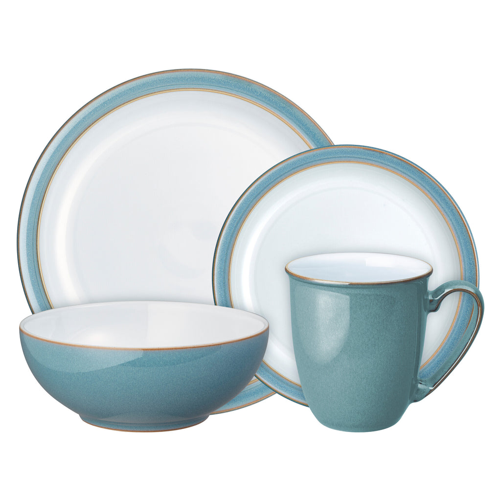 The Azure Rimmed 16 Piece Tableware Set has been design to mix seamlessly with Azure Coupes and Azure Haze, and is ideal for those looking for a white face rimmed and more traditional collection. It features the stunning cool aquamarine and pure white glaze. Sustainably made and hand crafted in our Derbyshire pottery this Azure shape is styled by life and designed to be used and loved every day. Including x4 Dinner Plates, x4 Small Plates, x4 Coffee Beakers and x4 Cereal Bowls.
