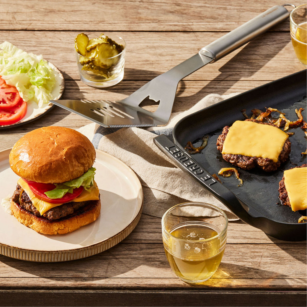 Made from rust-resistant stainless steel, the Slotted Turner is essential for flipping food on the grill. Its generous size keeps hands away from the heat, and the thin edge easily slides under food while the slots drain grease. Ridges on the sides make cleaning grill grates a breeze.